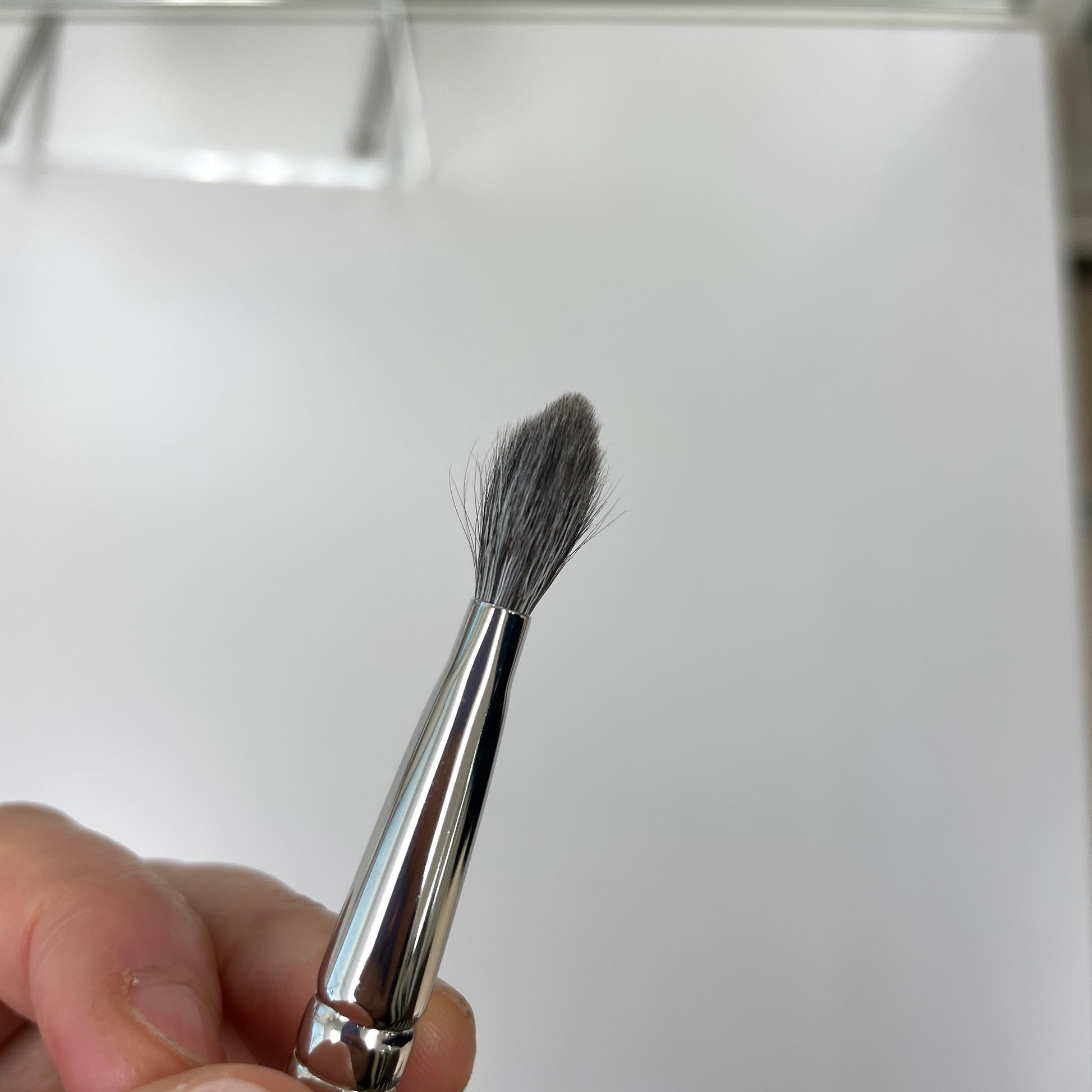 An eyeshadow brush made from a blend of gray squirrel and goat hair, offering a soft touch and natural color application. It is conveniently sized for applying the main color to the eye socket area.