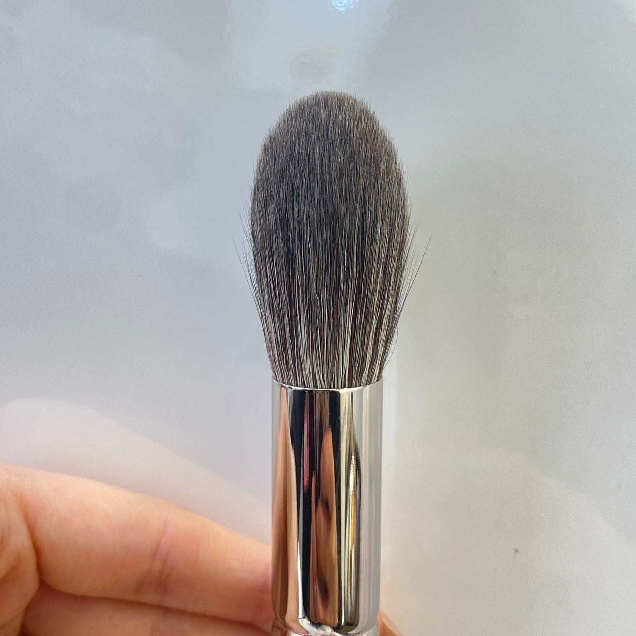 The uniquely designed pointed shape, with bristles extending across the entire tip, offers excellent control and achieves the desired color payoff. This brush is outstanding for applying highlights. It combines the right amount of firmness with a soft touch on the skin, featuring a blend of gray squirrel and goat hair.